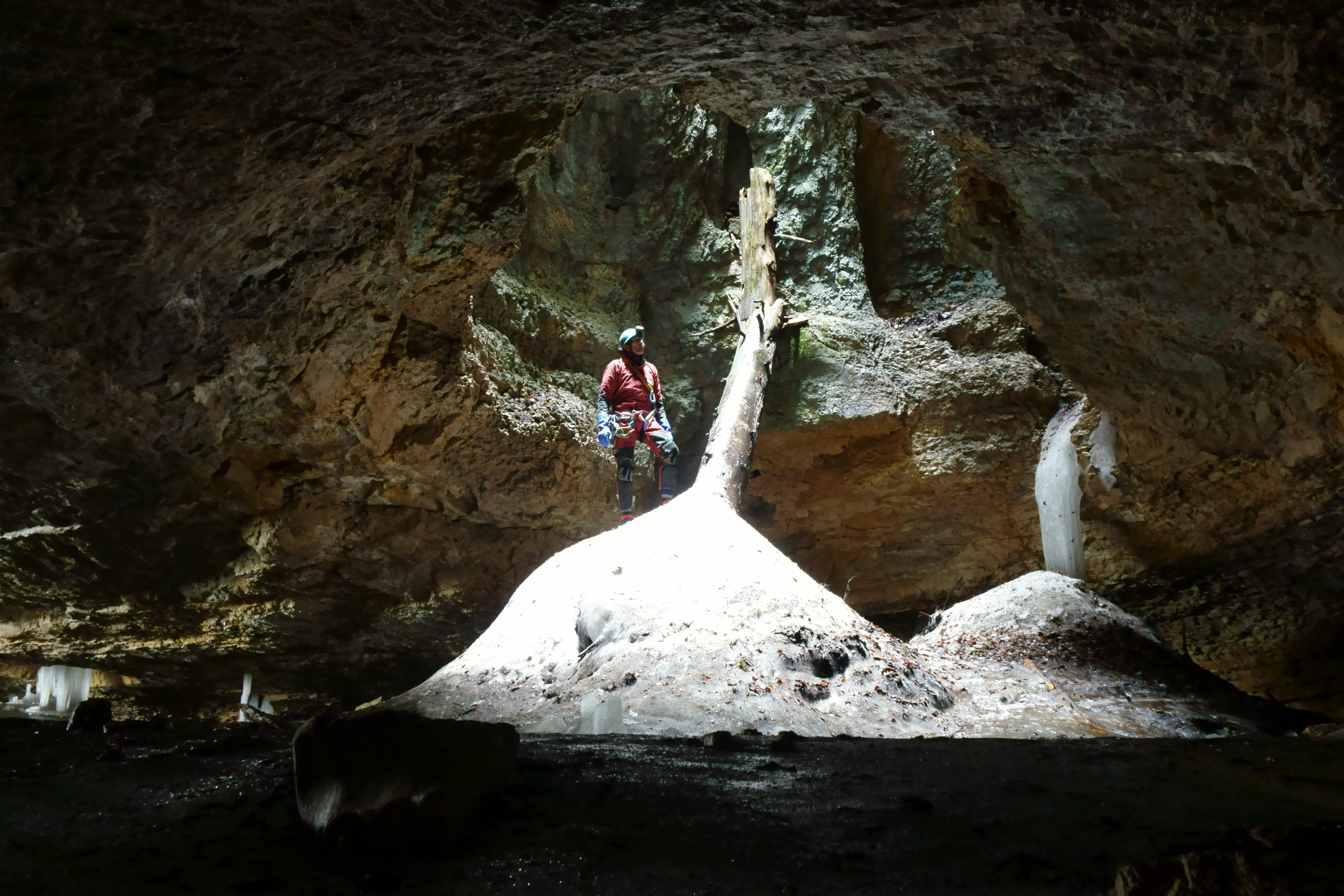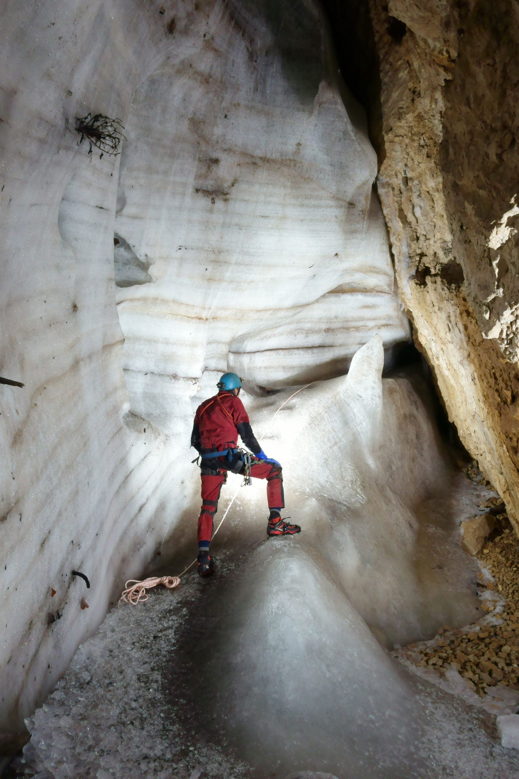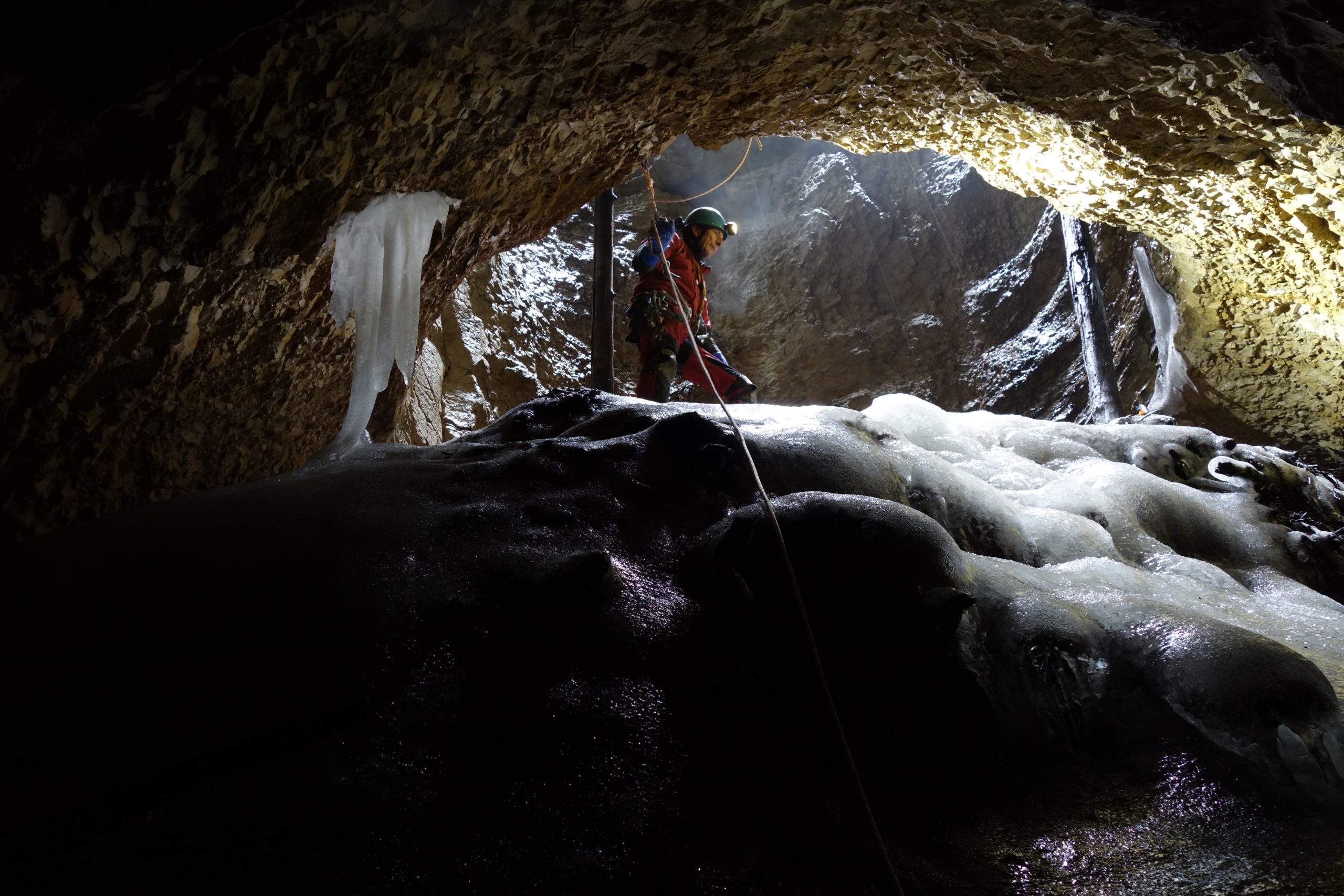 “C’est dingue: les pierres tombent pendant plus de deux secondes et produisent un grand Booom venant de très loin !” nous avait-il rapporté, après être descendu les premiers ressauts en libre. Certes. Mais quand vous lancez un caillou sur un toboggan, il glissera aussi pendant plus de deux secondes et produira un petit “poum” amorti, semblant venir de très loin à travers l’étroit conduit, en chutant librement les trois derniers mètres. C’est en tout cas ce que nous avons pu constater.